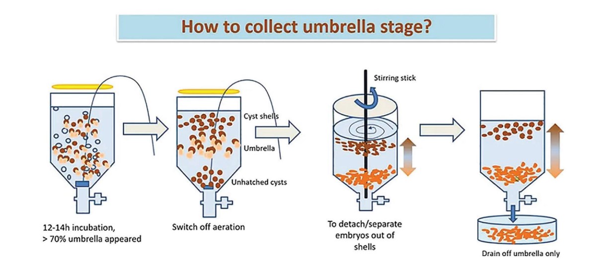 Các bước trong hình từ trái sang phải: Làm thế nào để thu được Artemia giai đoạn bung dù?