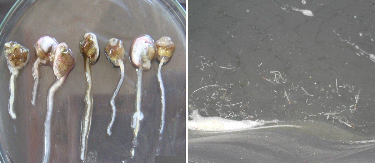 Dr. McIntosh observed that there is a clear association between EHP and white feces disease (WFD), another serious illness in farmed shrimp. Left: excised hepatopancreas of WFD-affected shrimp. Right: white fecal strands typical of WFD at the edge of a shrimp pond.