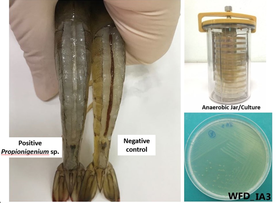 Now, at the same time we’re working with isolating anaerobic bacteria, not knowing what we’re doing, Dr. Kallaya from Mahidol University in Thailand had collected white feces from several areas in Thailand. Dr. Kallaya performed a metagenomic blast (Basic Local Alignment Search Tool, BLAST, the most well-known and commonly used tool for DNA search and alignment) of those feces to identify the bacteria and the white feces. And the bacterium that she found common to all of the white feces shrimp was Propionigenium.