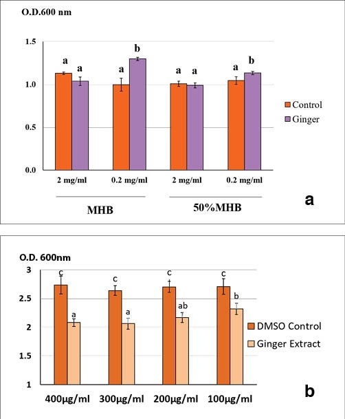 Figure 1. Average optical density readings at 600nm indicative of Vibrio parahaemolyticus 3HP planktonic cell growth or growth in broth (a) and biofilm thickness (b). In figure (a), the planktonic cells of the bacteria were grown in half and full-strength MHB medium with and without ginger extract at two different concentrations (2mg/mL and 0.2mg/mL). The extract at the lower concentration (0.2mg/mL) did not inhibit bacterial growth but significantly promoted it when compared to controls. In figure (b), average O.D. reading of crystal violet stained biofilms in the presence and absence of ginger extract at different concentrations and in MHB. The extract significantly (P<0.05) inhibited biofilm at all extract concentrations when compared with the controls. Adapted from Soowannayan et al. (2019).