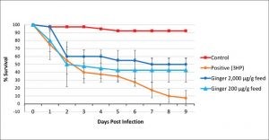 Figure 2. Graph showing cumulative % survival of Penaeus vannamei post larvae fed with ginger extract-supplemented feed after challenge with AHPND-causing Vibrio bacteria (3HP strain). Adapted from Soowannayan et al. (2019).