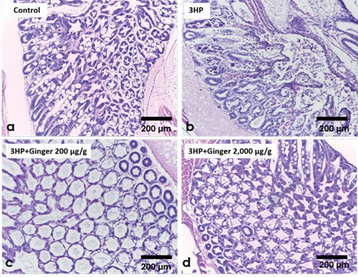 Figure 3. (a) Hepatopancreatic tissue of an unchallenged negative control shrimp showing normal histology; (b) Hepatopancreas of a moribund shrimp from the VAHPND 3HP-challenged group fed un-supplemented feed and showing massive sloughing of tubule epithelial cells pathognomonic for AHPND; (c) Hepatopancreas of a moribund shrimp from the 3HP-challenged group fed with 200μg ginger supplement and showing abnormal collapsed tubule epithelia but no pathognomonic AHPND lesions; (d) Hepatopancreas of a surviving shrimp from the 3HP-challenged group fed with 2000μg ginger supplement and showing normal histology. Adapted from Soowannayan et al. (2019).