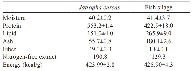 Hạt của J. curcas được lấy từ một cánh đồng thí nghiệm nằm ở Mazatlán, Sinaloa, Mexico (23°14’29” N và 106°24’35” W). Hạt tách vỏ lấy nhân. Nhân được sấy khô và nghiền nhỏ để làm thức ăn. Do hàm lượng lipid trong bột J. curcas cao (49,66±0,37%), nên tỷ lệ 1,5:10 p:v hexane được hòa tan trong bột, lọc và sấy khô, cuối cùng được bảo quản ở 4°C trước khi sử dụng.