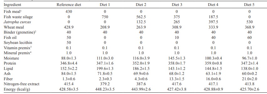 Thức ăn chăn nuôi được nghiền (Grindmaster, Model 505, Louisville, KY, USA), sàng (No. 60, FIIC, SA de CV, MX) qua rây 100-µ và trộn trong máy xay (KitchenAid, Model 600, Benson Harbor, MI, Hoa Kỳ) trong 30 phút. Thêm dầu cá, lecithin đậu nành và nước để tạo thành hỗn hợp sệt. Hỗn hợp ướt được ép viên qua máy xay thịt (Torrey®, M-22R), hấp trong 5 phút và sấy khô trong tủ sấy khô ở nhiệt độ 60°C qua đêm hoặc cho đến khi các viên chứa độ ẩm dưới 10%. Cuối cùng, khẩu phần được chia nhỏ ở kích thước 3-4 mm và bảo quản trong túi nhựa ở nhiệt độ 5°C cho đến khi sử dụng.