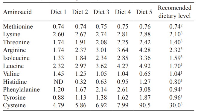 Ngoại trừ năng lượng, các thành phần dinh dưỡng của các khẩu phần ăn thử nghiệm có sự khác biệt (Bảng 1). Hàm lượng protein cao hơn 42% CP trong JCK và FS. JCK và FS có hàm lượng protein, chất xơ và NFE cao hơn, nhưng hàm lượng lipid và tro thấp hơn. JCK có hàm lượng axit amin cao hơn FS, ngoại trừ valine. JCK có hàm lượng cysteine (17,00 g/kg) và leucine (9,28 g/kg) cao gấp ba lần FS. FS không có histidine (Bảng 2). So sánh với khẩu phần ăn khuyến nghị cho tôm cho thấy khẩu phần ăn 75% FS/0%JCK thiếu arginine, isoleucine, histidine và tyrosine, khẩu phần ăn 56,25% FS/13,25%JCK và 26,5%FS/30,89%JCK thiếu histidine và khẩu phần ăn 0%FS/53%JCK thiếu valine (Bảng 4).