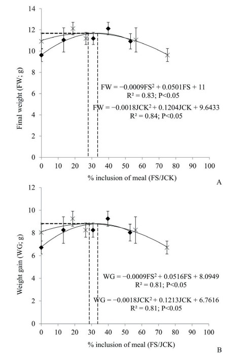 FS – cá ủ chua; JCK – Bột hạt Jathropa curcas; SE – lỗi tiêu chuẩn. Tỷ lệ phần trăm FS và JCK mang lại trọng lượng cuối cùng tối đa, mức tăng trọng và tốc độ tăng trưởng cụ thể được biểu thị (đường đứt nét, × cho FS và ♦ cho JCK) (trung bình±SE; n = 35).