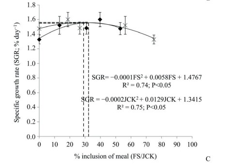 Sự bao gồm đầy đủ nhất của FS và JCK, dựa trên trọng lượng cuối cùng tối đa, WG và SGR của tôm được nghiên cứu trong điều kiện phòng thí nghiệm, được xác định bằng phương trình bậc hai (Shearer, 2000):