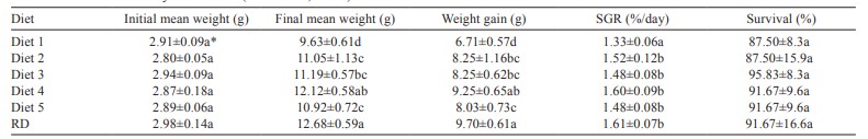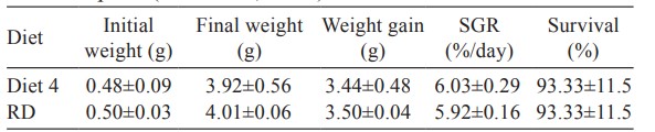 Sau 35 ngày nuôi trong ao, tôm được cho ăn khẩu phần ăn RD và 18,75%FS/39,75%JCK tương tự nhau (P>0,05) về trọng lượng cuối cùng, WG, SGR và tỷ lệ sống (Bảng 6).