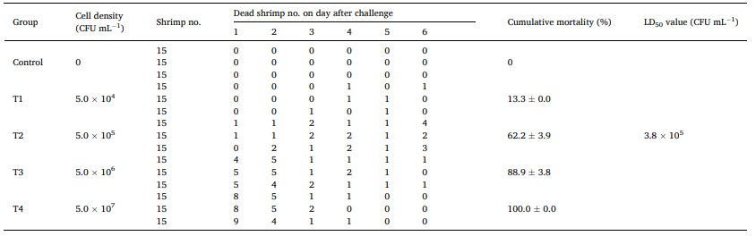 Xét nghiệm độc lực bao gồm một nhóm đối chứng và bốn nhóm điều trị. Trước khi thử nghiệm này, một huyền phù nuôi cấy tươi của phân lập gây bệnh đã được chuẩn bị theo mô tả của Wang và cộng sự (2019), và mật độ tế bào của nó được xác định là 1011 CFU/ mL bằng phương pháp trải tấm sau khi pha loãng nối tiếp 10 lần trong nước muối sinh lý vô trùng (Saraoui và cộng sự, 2018). Trong các nhóm xử lý, ba bể gồm 15 con tôm khỏe mạnh đã bị cảm nhiễm bằng cách ngâm trong 100 L nước nuôi đã lọc với phân lập gây bệnh ở mật độ tế bào cuối cùng là 5,0 × 104 đến 5,0 × 107 CFU/ mL. Ba bể khác gồm 15 con tôm khỏe mạnh, tiếp xúc với các điều kiện thí nghiệm tương tự, không bị cảm nhiễm và được dùng làm đối chứng. Tất cả tôm thử nghiệm được giữ ở mức 28ºC mà không cần thay nước. Tỷ lệ chết được ghi nhận mỗi ngày trong 6 ngày. Tôm chết ngay lập tức được vớt ra để tái phân lập và xác định mầm bệnh để xác nhận xem tôm chết có phải do cảm nhiễm với phân lập hay không. Giá trị liều gây chết trung bình (LD50) được tính bằng phương pháp Bliss (Finney, 1985).