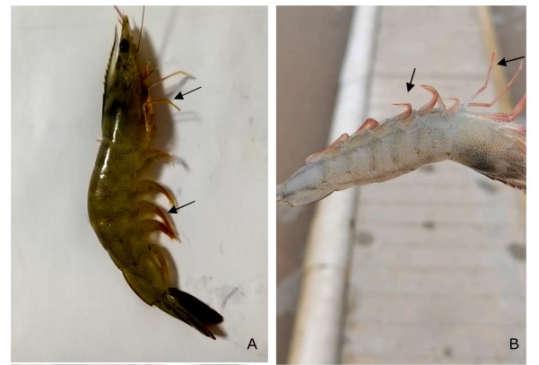 Hình 1. Dấu hiệu gộp của tôm bị ảnh hưởng mắc bệnh đỏ chân: A. Tôm bị ảnh hưởng tự nhiên trong vùng bùng phát dịch bệnh; B. Tôm thử nghiệm gặp khó khăn với SHF1 cô lập. Mũi tên cho thấy periepads và pleopods đỏ; C. Tôm khỏe mạnh. Mũi tên cho thấy periepads và pleopods bình thường.