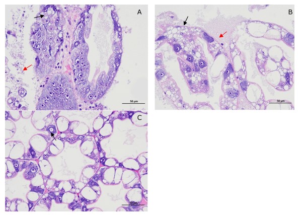Hình 2. Thay đổi mô bệnh học ở gan tụy của tôm bị ảnh hưởng: A. Sắp xếp rối loạn các ống gan tụy (mũi tên đen) và thâm nhiễm tế bào viêm (mũi tên đỏ) trong gan tụy bị nhiễm bệnh tự nhiên; B. Sắp xếp rối loạn các ống gan tụy (mũi tên đen) và thâm nhiễm tế bào viêm (mũi tên đỏ) trong gan tụy bị nhiễm trùng nhân tạo; C. Sự sắp xếp bình thường của ống gan tụy (mũi tên đen) trong gan tụy khỏe mạnh.