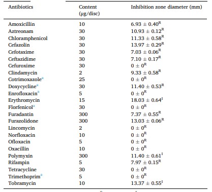 Dữ liệu (Bảng 3) chỉ ra rằng phân lập SHF1 nhạy cảm vừa phải với erythromycin, polymyxin, tobramycin và kháng amoxicillin, aztreonam, chloramphenicol, cefazolin, cefotaxime, ceftazidime, cefuroxime, clindamycin, cotrimoxazole, doxycycline, enrofloxacin, florfenicol, furadantin, furazolidone, lincomycin, norfloxacin, ofloxacin, oxacillin, rifampin, tetracycline, trimethoprim. Điều này cho thấy rằng phân lập SHF1 đã phát triển nhiều loại kháng sinh đối với kháng sinh chloramphenicols, quinolone và tetracycline được sử dụng trong nuôi trồng thủy sản.