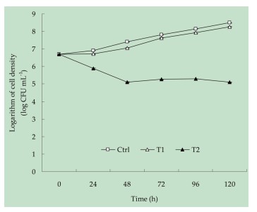 Hình 4. Tác dụng kháng khuẩn của bột Bdellovibrio chống lại phân lập SHF1; Ctrl: 0 mg/ L bột Bdellovibrio; T1: 0,4 mg/ L bột Bdellovibrio; T2: 0.8 mg/ L bột Bdellovibrio. Dữ liệu được trình bày dưới dạng giá trị trung bình ± SD. Bất kỳ sự khác biệt nào quan sát được đều được coi là có ý nghĩa thống kê ở mức P < 0,05 theo thử nghiệm của Duncan.
