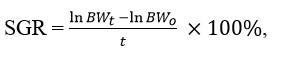 Trong đó: BWt là trọng lượng cơ thể cuối cùng (g); BWo là trọng lượng cơ thể ban đầu (g); và t là thời lượng của thí nghiệm (ngày).