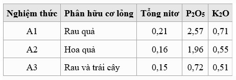 Phân hữu cơ dạng lỏng với rau chứa hàm lượng nitơ tổng số, P2O5, và K2O cao nhất so với các nghiệm thức khác (Bảng 4). Hàm lượng P2O5 thấp trong phân hỗn hợp tương phản với hàm lượng PO4 cao trong nước bể. Đối với hàm lượng N trong phân hữu cơ và nước trong bể, các nghiệm thức trái cây và rau củ đã thay đổi thứ hạng.