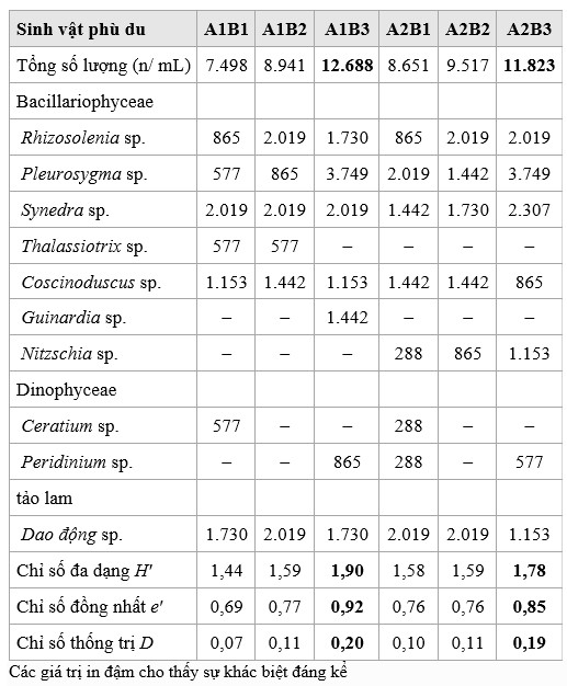Chỉ số đa dạng sinh vật phù du được tính toán bằng phương trình Shannon và Wiener và chỉ số thống trị theo phương trình Margalef. Các kết quả được trình bày một cách mô tả.