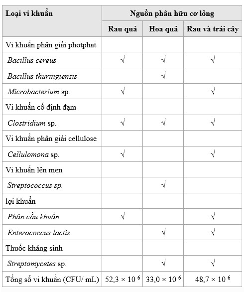 Tổng số vi khuẩn là cao nhất đối với phân hữu cơ dạng lỏng từ rau củ, thấp nhất đối với phân trộn từ trái cây và trung bình đối với hỗn hợp rau củ quả (Bảng 6). Bacillus cereus và Clostridium sp. đã được tìm thấy trong cả ba, trong khi Streptococcus sp. và Bacillus thuringiensis chỉ được tìm thấy trong phân hoa quả. Hai thứ sau không được tìm thấy trong phân ủ hỗn hợp. Chỉ có bốn trong số sáu loài được tìm thấy trong phân trộn trái cây cũng được tìm thấy trong phân trộn hỗn hợp, trong khi tất cả vi khuẩn được tìm thấy trong phân trộn rau củ được tìm thấy trong phân trộn lỏng. Vi khuẩn có đặc tính hòa tan P, cố định N, phân hủy cellulose, lên men, lợi khuẩn hoặc kháng sinh; nhưng vi khuẩn hòa tan P, Microbacteriu sp., chiếm ưu thế trong hỗn hợp không có B. thuringiensis từ phân hoa quả.