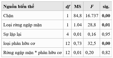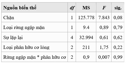 Bảng 1. ANOVA ô chia đa yếu tố về tác động của lá rừng ngập mặn và loại phân hữu cơ đối với tôm sú P. monodon SR