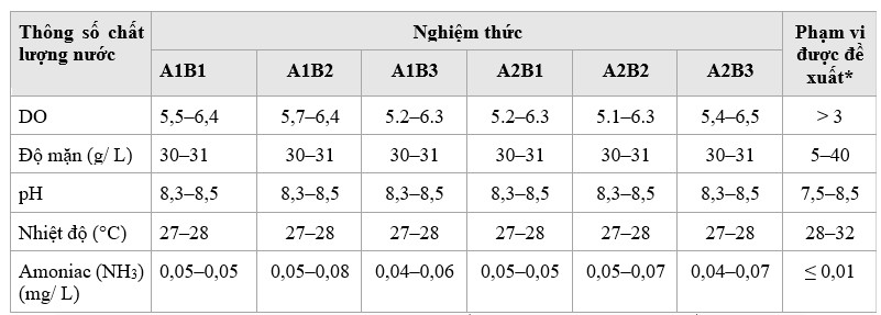 Trong quá trình nghiên cứu, mức độ DO, độ mặn, pH và nhiệt độ không khác biệt đáng kể trrong nghiệm thức (Bảng 3). Mặc dù nhiệt độ ở giới hạn dưới và độ pH gần với giới hạn trên, nhưng các thông số chất lượng nước và vật lý này, cũng như DO, vẫn nằm trong phạm vi được khuyến nghị cho nuôi tôm. Nồng độ amoniac khá cao so với tiêu chuẩn và dao động nhiều hơn nhưng không khác biệt đáng kể giữa các nghiệm thức. Tình trạng của tôm ở tất cả các nghiệm thức đều bình thường vì hàm lượng duy trì dưới mức gây độc (0,08 mg/ L).
