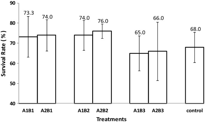 Hình 1. Biểu đồ tỷ lệ sống trung bình, với độ lệch chuẩn, của tôm sú cho mỗi nghiệm thức
