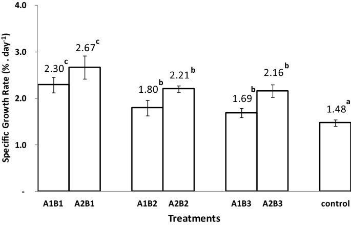Tốc độ tăng trưởng cụ thể (SGR, tính bằng %/ ngày) được tính bằng công thức của Busacker và cộng sự (1990):