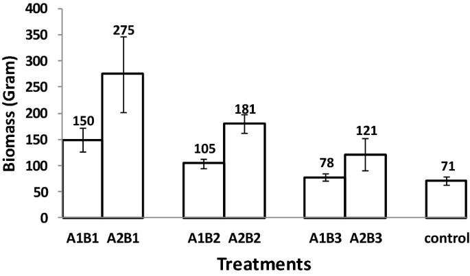 Phân lỏng (p < 0,001) cải thiện đáng kể sinh khối của tôm so với đối chứng; trong các nghiệm thức phân hữu cơ, lá A. marina được cắt nhỏ có tác dụng đáng kể (p <0,01) so với toàn bộ lá. Mỗi bể, sinh khối cuối cùng của tôm là cao nhất, 275 ± 72 g, trong nghiệm thức phân hữu cơ và lá cây; trung gian cho trái cây ủ với lá, 181 ± 18 g; và thấp nhất đối với đối chứng, 71 ± 8,6 g (Hình 3). Sinh khối của các bể có lá A. marina cắt nhỏ cao hơn khoảng 40% so với các bể có cả lá.