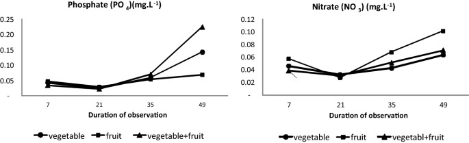 Tần suất lấy mẫu không đủ để so sánh thống kê về tác động của các nghiệm thức đối với sự thay đổi chất dinh dưỡng. Tuy nhiên, nồng độ trung bình của PO4 và NO3 trong bể tăng lên trong quá trình thí nghiệm lần lượt từ 0,07 ± 0,0 đến 0,12 ± 0,1 mg/ L và từ 0,05 ± 0,02 đến 0,07 ± 0,03 mg/ L (Hình 4). Cả hai thông số đều có cùng xu hướng giảm nhẹ trong 2 tuần đầu tiên và tăng dần trong các tuần tiếp theo. Đối với PO4, mức tăng là mạnh nhất đối với phân hữu cơ hỗn hợp và trung gian đối với phân hữu cơ rau, trong khi không thấy ảnh hưởng nào đối với phân hoa quả. Đối với NO3, sự gia tăng tương đối chỉ được quan sát thấy đối với phân hữu cơ hoa quả.