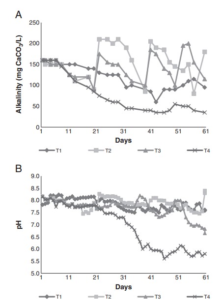 Việc hiệu chỉnh độ kiềm và pH được thực hiện ở các giá trị tương ứng là 100 mg CaCO3/L và ≤7,5. T2 được điều chỉnh độ pH và độ kiềm ba lần: vào ngày thử nghiệm thứ 20, 39 và 56 (Hình 2A). T3 được điều chỉnh độ kiềm ba lần: vào ngày thử nghiệm thứ 20, 37 và 50 (Hình 2A). T1 được điều chỉnh độ pH năm lần: sau ngày thử nghiệm thứ 27 và sau đó cứ 8 ngày một lần (Hình 2B). T4 không có sự điều chỉnh độ pH và độ kiềm dẫn đến giảm cả hai (Hình 2A và B).