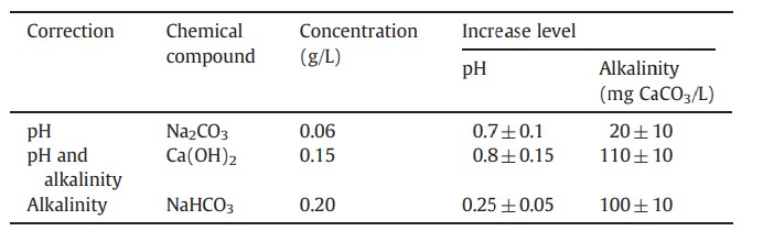 Hiệu quả của các hợp chất hóa học được sử dụng để điều chỉnh độ pH và độ kiềm được phân tích trong nước biển có các khối vi sinh vật và không có tôm. Các thử nghiệm đã được thực hiện, với hai lần lặp lại, trong các bể nhựa (thể tích hữu ích là 2 L) với mỗi bể có một đá khí để cung cấp sục khí. Độ pH và độ kiềm được đo trước khi sử dụng (độ pH ban đầu là 7,0 và độ kiềm ban đầu là 100 mg CaCO3/L), 1 giờ sau khi sử dụng và 24 giờ sau khi sử dụng các hợp chất hóa học. Các hợp chất hóa học được thử nghiệm cũng như liều lượng, mục đích sử dụng và mức tăng độ pH, độ kiềm được trình bày trong Bảng 1. Số lượng các hợp chất hóa học cần thiết để điều chỉnh độ pH và độ kiềm được tính theo các phương trình dưới đây: