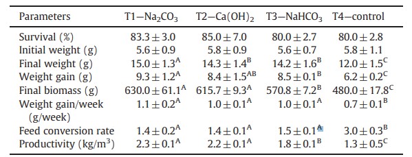 Những dữ liệu này đã khẳng định rằng các giá trị độ kiềm có thể giảm xuống dưới 20 mg CaCO3/L nếu không sử dụng vật liệu cacbonat. Canxi cacbonat không hiệu quả trong việc tăng độ kiềm, nhưng natri bicarbonate và canxi hydroxit có độ tinh khiết cao lại có hiệu quả trong việc kiểm soát độ kiềm của tôm nuôi được xử lý bằng ozone. Việc điều chỉnh độ kiềm thông qua việc sử dụng natri bicarbonate và canxi hydroxit, trái ngược với natri cacbonat, có hiệu quả trong việc tăng độ kiềm trong môi trường nuôi cấy BFT.