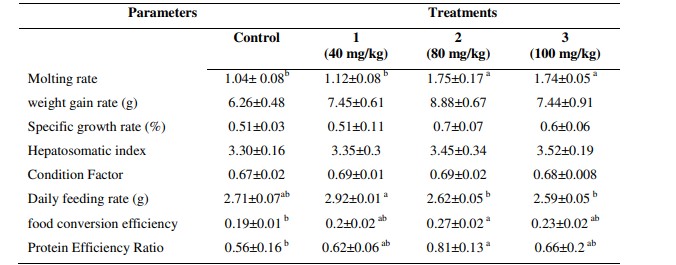 Vào cuối thử nghiệm cho ăn 56 ngày, tỷ lệ lột xác cao ở tôm được cho ăn với khẩu phần ăn 80 và 100 mg/kg chiết xuất tỏi và thấp nhất ở tôm được cho ăn theo khẩu phần ăn 40 mg/kg và nhóm được cho ăn theo khẩu phần ăn không bổ sung chiết xuất tỏi ( p < 0,05) (Bảng 1).