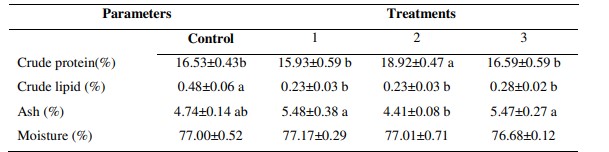 Kết quả phân tích thành phần cơ thể bao gồm protein tổng số, chất béo, tro và độ ẩm từ các mẫu mô cơ được trình bày trong Bảng 2.