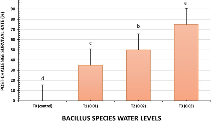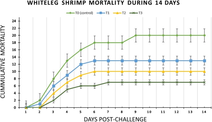 Tôm được nuôi trong nước có chứa probiotic của loài Bacillus có khả năng chống nhiễm F. solani cao hơn nhóm đối chứng, nhóm có tỷ lệ tử chết cao nhất. Khi liều probiotic tăng lên trong nước nuôi, tỷ lệ chết giảm xuống sau mỗi lần bổ sung (Hình 1). Tỷ lệ sống của tôm ở nhóm T3 cao nhất (75%); tuy nhiên, tỷ lệ này là 0% đối với nhóm đối chứng không bổ sung probiotic (Hình 2).