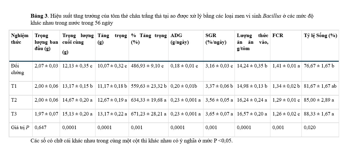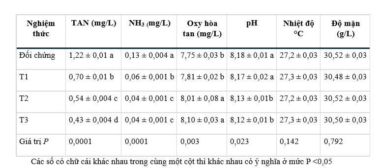 Tất cả các chỉ số chất lượng nước đều phù hợp với nuôi tôm (Bảng 1). Tổng nitơ amoniac (TAN) và amoniac liên kết bị ảnh hưởng bởi probiotic của loài Bacillus vì giá trị của chúng giảm do tăng hàm lượng probiotic. Nghiệm thức đối chứng có hàm lượng TAN và amoniac cao, trong khi mức thấp nhất được quan sát thấy ở T2 và T3, nhận được 0,02 và 0,03 g/m3 probiotic loài Bacillus. Mặt khác, mức DO tăng lên đáng kể khi bổ sung probiotic, trong khi độ pH giảm. Ngược lại, việc bổ sung probiotic vào nước không ảnh hưởng đáng kể đến nhiệt độ nước và độ mặn (P > 0,05).