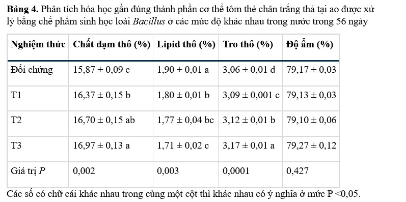 Nghiên cứu này cho thấy nước được bổ sung probiotic Bacillus làm tăng hàm lượng protein thô và tro của tôm so với đối chứng. Những phát hiện này phù hợp với những báo cáo của Cao và cộng sự (2022), đã phát hiện ra rằng việc áp dụng một nồng độ probiotic cụ thể có thể làm tăng hàm lượng protein cơ thô của tôm thẻ chân trắng so với nhóm đối chứng. Seenivasan và cộng sự (2014) tuyên bố rằng dùng đường uống kết hợp LactoBacillus sporogenes, B. subtilis và Saccharomyces cerevisiae đã tăng cường hàm lượng protein thô và tro trong thân thịt gà. Ngược lại với những phát hiện của chúng tôi, Yu và cộng sự (2009) và Heizhao và cộng sự (2008) xác nhận rằng probiotic trong khẩu phần ăn không ảnh hưởng đến thành phần cơ thể của tôm thẻ chân trắng.
