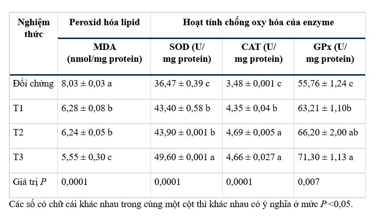 Hoạt tính của các enzym SOD, CAT và GPx được cải thiện đáng kể khi thêm vi khuẩn Bacillus vào nước so với nghiệm thức đối chứng (P < 0,05; Bảng 5). Ngược lại, nồng độ MDA giảm khi tăng lượng Bacillus trong nước ao so với nghiệm thức đối chứng (P < 0,05).