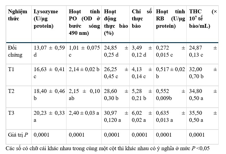 Tổng số lượng tế bào máu (THC) được xác định bằng máy đo huyết cầu và được kiểm tra dưới kính hiển vi soi nổi (Supamattaya và cộng sự 2000). Hàm lượng lysozyme trong huyết tương được đánh giá bằng cách phân giải dung dịch vi khuẩn Gram dương Micrococcus luteus (M3770-25G Lô 117K8707, Sigma-Aldrich), theo Zanuzzo và cộng sự (2017).