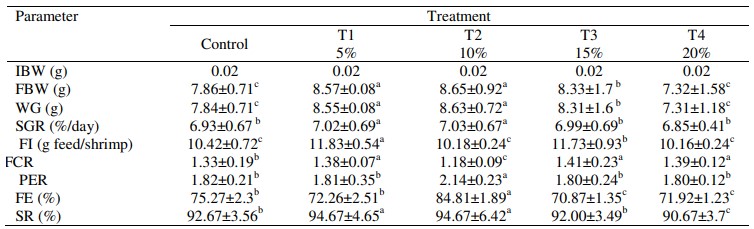 Bảng (3) trình bày ảnh hưởng của việc thay thế hàm lượng protein Spirulina platensis trong khẩu phần ăn khác nhau lên hiệu suất tăng trưởng và việc sử dụng thức ăn trong các bể thí nghiệm của L. vannamei. Sau thử nghiệm 90 ngày cho ăn, mức tăng trọng trung bình của tôm được cho ăn khẩu phần ăn T1 và T2 khác biệt đáng kể (P<0,05) so với khẩu phần ăn đối chứng. Khẩu phần ăn tảo xoắn thay thế bột cá ở mức 5 và 10% cho thấy tăng cân cao hơn; 8,55±0,08g đối với T1 và 8,63±0,72g đối với T2. Nghiệm thức 10% (T2) có hiệu quả sử dụng thức ăn (FE) và tỷ lệ hiệu quả sử dụng protein (PER) tốt nhất đáng kể (P<0,05) so với các nhóm thử nghiệm còn lại.