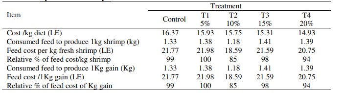 Tính toán hiệu quả kinh tế của các khẩu phần thử nghiệm dựa trên chi phí thức ăn, chi phí cho một Kg tăng trọng và tỷ lệ của nó với nhóm đối chứng được trình bày trong Bảng (4). T2 có chi phí thức ăn trên mỗi kg tôm tươi thấp nhất (18,59 LE), % chi phí thức ăn/kg tôm (85%), chi phí thức ăn/Kg tăng trọng (18,59 LE) và % chi phí thức ăn tương đối trên Kg tăng trọng (85%) .