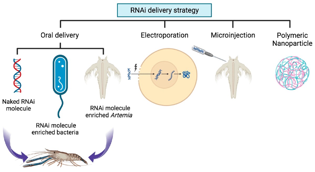 Việc phân phối các phân tử RNAi hiệu quả nhất đã đạt được bằng cách cho ăn vi khuẩn giàu DSRNA và hợp tử Artemia sống (tế bào trứng được thụ tinh từ sự kết hợp của trứng cái với tinh trùng đực) và đường miệng là phương pháp hứa hẹn nhất để cung cấp RNAi trong môi trường nước.