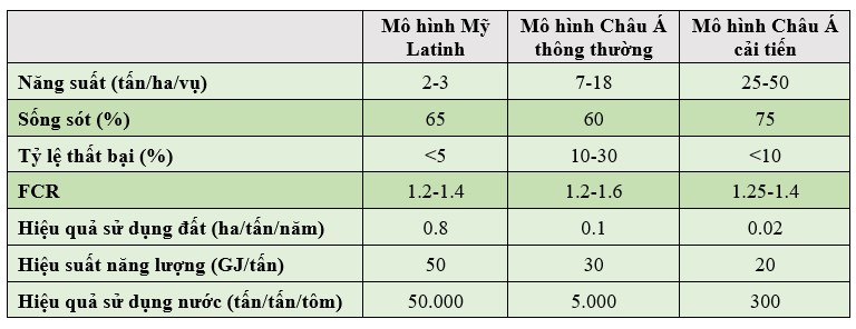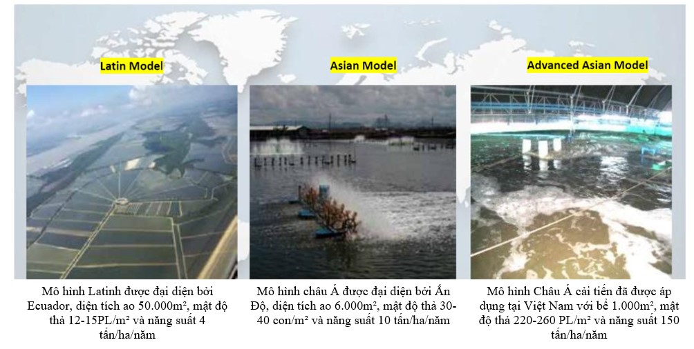 Về mô hình, có 3 mô hình nuôi, bao gồm mô hình Mỹ Latinh với các ao có diện tích lớn, mô hình châu Á bắt đầu với các ao nhỏ hơn và sau đó phát triển thành mô hình châu Á cải tiến với các ao và bể thậm chí còn nhỏ hơn với mục đích kiểm soát chặt chẽ hơn.