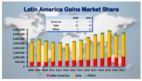 McIntosh đã tiếp cận vấn đề bằng cách xem xét sản lượng mà thị trường có thể tiêu thụ trong tương lai (2030) để đưa ra phương hướng sản xuất phù hợp. Một phân tích hồi quy dựa trên 10 năm sản xuất đã đưa ra con số 5 triệu tấn là nhu cầu mục tiêu vào năm 2030, cao hơn 1,5 triệu tấn so với sản lượng hiện tại là 3,5 triệu tấn (Hình 1). So sánh thị phần từ năm 2008, McIntosh cho biết ngành tôm ở Mỹ Latinh ngày càng tăng thị phần tôm toàn cầu (Hình 2). “Họ đã tăng từ 13% năm 2008 lên 27% vào năm 2021. Châu Á chiếm 82% sản lượng tôm toàn cầu vào năm 2008 và hiện giảm xuống còn 63%.”