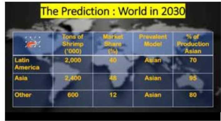 Khi thảo luận về thị phần cho sản lượng toàn cầu 5 triệu tấn trong tương lai vào năm 2030, đây chỉ là dự báo dựa trên dữ liệu trước đó, McIntosh dự đoán rằng Mỹ Latinh với mô hình môi trường sạch của họ sẽ chiếm 40% thị phần. Ông nói thêm rằng 70% sản lượng của Mỹ Latinh sẽ đến từ các trang trại sử dụng mô hình châu Á với tôm SPF. Châu Á sẽ có 48% thị phần, với 95% sử dụng các mô hình thâm canh của Châu Á. Các nước sản xuất tôm khác như Trung Đông sẽ đóng góp 600.000 tấn theo mô hình châu Á.