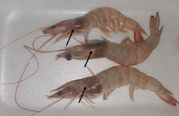 Hình 1: Tôm thẻ chân trắng L. vannamei bị nhiễm F. solani cho thấy mang có màu đen đến nâu (sắc tố cao) rõ rệt (mũi tên đen). Phỏng theo bản gốc.
