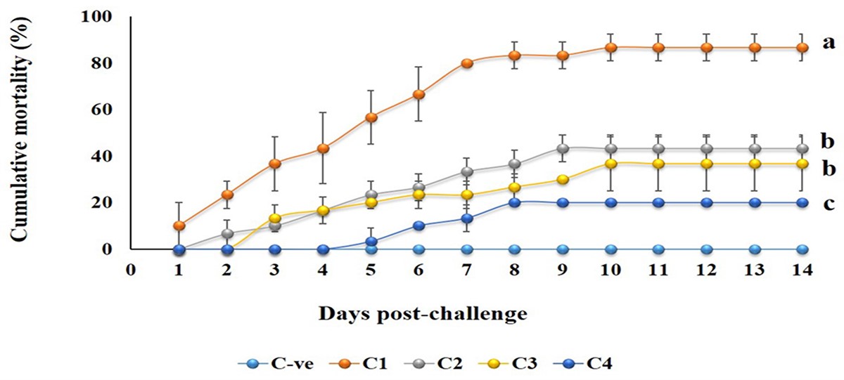 Hình 2: Tỷ lệ chết tích lũy (%) theo thời gian (Ngày 0–14) đối với tôm thẻ chân trắng, L. vannamei, sau khi cảm nhiễm với F. solani; tôm được cho ăn với chế độ ăn có bổ sung β-1,3 glucan và fructooligosaccharides (β-1,3 GF) (tương ứng là 0, 0,5, 1, 1,5 g/kg; C1–C4). C-ve, đề cập đến các nhóm tôm nhận được chế độ ăn cơ bản bình thường và được tiêm bắp PBS. Các giá trị trung bình (SD±) với các chữ cái khác nhau biểu thị sự khác biệt đáng kể trong xét nghiệm ANOVA.