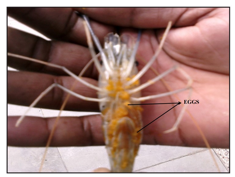 Hình 2 M. rosenbergii cái có quả mọng đẻ trứng vào bụng thông qua sợi kết dính.