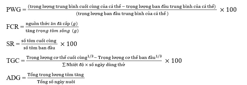 Các thông số nước, bao gồm oxy hòa tan (DO), độ pH, nhiệt độ nước và độ mặn, được đo bốn lần mỗi ngày bằng cảm biến thời gian thực (thiết bị Aqua TROLL 500 Multiparameter Sonde) và được kết nối với ứng dụng AquaEasy (Bosch, Singapore) để ghi dữ liệu trực tuyến hệ thống. Các thông số về tổng amoniac-nitơ (TAN), nitrat, nitrit và phốt phát được đo mỗi tuần một lần bằng phương pháp đo quang phổ hấp thụ (HACH, Hoa Kỳ) và được tiến hành tại Trung tâm Phát triển Nuôi trồng Thủy sản Nước lợ Chính (Jepara, Trung Java, Indonesia). Vào cuối giai đoạn cho ăn, tất cả tôm được phân nhóm và cân ngẫu nhiên để tính toán sinh khối cuối cùng, trọng lượng cơ thể cuối cùng (FBW), tỷ lệ tăng trọng (PWG), tỷ lệ chuyển đổi thức ăn (FCR), tỷ lệ sống (SR), đơn vị nhiệt. hệ số tăng trưởng (TGC) và tốc độ tăng trưởng bình quân ngày (ADG) như sau: