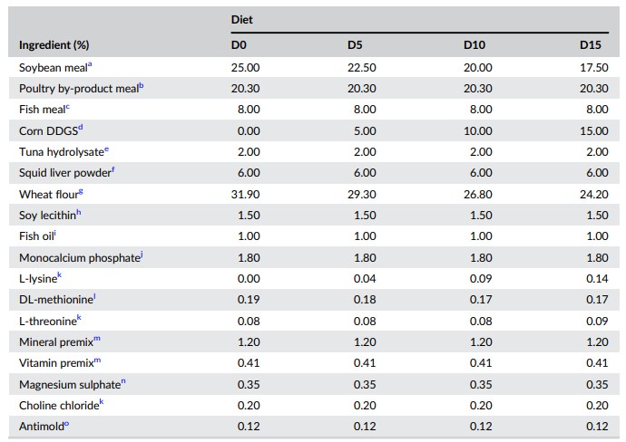 Mục tiêu của nghiên cứu này là giảm lượng bột đậu nành (SBM) và tăng lượng ngũ cốc chưng cất khô (DDGS) trong thức ăn cho tôm. Tất cả các khẩu phần thử nghiệm đều được xây dựng theo công thức iso-nitrogen và iso-lipidic (40% protein và 7% lipid). Trong nghiên cứu này, khẩu phần cơ bản (D0) được xây dựng với 25% SBM, 8% FM, 20,3% bột phụ phẩm gia cầm (BPM) và 31,9% bột mì (WF) làm nguyên liệu chính. Ba khẩu phần thử nghiệm được xây dựng với các mức bổ sung DDGS ngô khác nhau (5%, 10% và 15%) để thay thế một phần SBM. Khẩu phần cơ bản (D0) không chứa DDGS. Thức ăn thử nghiệm đầu tiên (Mã: D5) được thiết kế để chứa 5% DDGS ngô để thay thế việc sử dụng SBM, và khẩu phần thử nghiệm thứ hai và thứ ba được thiết kế để chứa 10 và 15% DDGS ngô tương ứng để thay thế việc sử dụng SBM. (được chỉ định là D10 và D15). Tất cả các khẩu phần được sản xuất tại Trung tâm Phát triển Nuôi trồng Hải sản Chính của Lampung bằng quy trình tiêu chuẩn. Thành phần dinh dưỡng và axit amin (AA) của khẩu phần ăn được phân tích tại Phòng thí nghiệm Saraswanti Indo Genetech, Bogor, Tây Java, Indonesia và được tóm tắt trong Bảng 2.