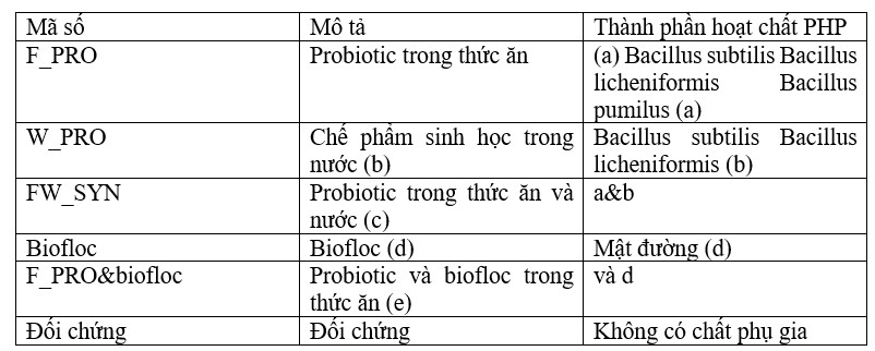 Đối với thử nghiệm này, PHP đã được chọn dựa trên công cụ đã phát triển trước đó là ‘dự án IMAQUlate’, trong đó PHP được đánh giá theo các yếu tố sau: mức độ sử dụng phổ biến, chứng nhận đảm bảo chất lượng sản xuất, phương thức hoạt động, thành phần hoạt chất và nồng độ. Hai yếu tố sau được đánh giá thông qua phân tích trong phòng thí nghiệm và so sánh với công bố của nhà sản xuất trên bao bì sản phẩm. PHP được chọn từ các sản phẩm ‘có điểm cao’ được đánh giá bằng công cụ phân tích phả hệ. Liều lượng, tần suất và phương thức sử dụng men vi sinh (Bảng 1) được sử dụng theo hướng dẫn của nhà sản xuất. Probiotic trong thức ăn đã được bổ sung dưới dạng 5g/kg thức ăn mỗi bữa cho các nghiệm thức F_PRO, FW_SYN và F_PRO&biofloc. Bột probiotic trong thức ăn, hỗn hợp Bacillus subtilis, Bacillus licheniformis, Bacillus pumilus, được trộn vào thức ăn 30 phút trước mỗi bữa ăn. Probiotic trong nước, Bacillus subtilis, Bacillus licheniformis, được thêm vào dưới dạng 1 g/1000 L nước mỗi ngày một lần cho nghiệm thức W_PRO và FW_SYN. Bột men vi sinh trong nước lần đầu tiên được thêm vào một lít nước bể và giữ trong điều kiện sục khí một giờ trước khi thêm vào bể theo hướng dẫn của nhà sản xuất. Trong các nghiệm thức xử lý bằng biofloc và F_PRO&biofloc, mật đường được bổ sung 3 lần mỗi ngày như một nguồn carbon (C) bên ngoài để điều chỉnh tỷ lệ Carbon (C):Nitơ (N) ở mức 16:1. Lượng C và N trong thức ăn và lượng mật đường thu được được tính toán theo Emerenciano và cộng sự (2012). Lượng mật đường được tính toán hàng ngày dựa trên lượng thức ăn và tỷ lệ C:N được điều chỉnh.