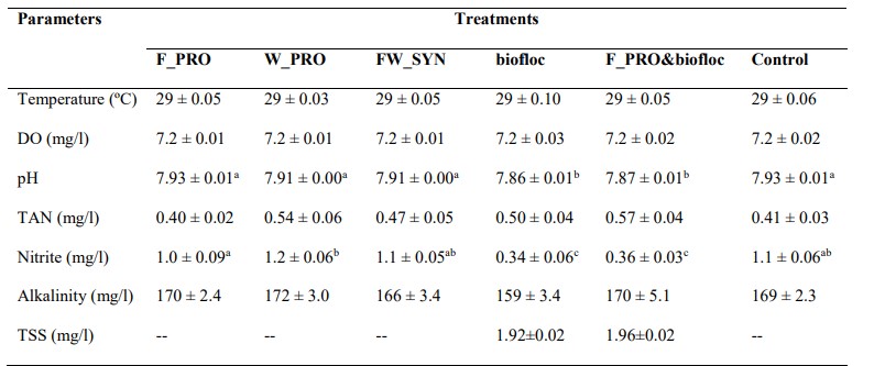 Tất cả các thông số chất lượng nước (Bảng 2) đều nằm trong phạm vi tối ưu cho sự phát triển của tôm (Kannupandi và cộng sự, 2002; Krishnaprakash, 2007; Uddin và cộng sự, 2013). Không có sự khác biệt đáng kể về giá trị trung bình của nhiệt độ, DO, độ kiềm và TAN giữa các nghiệm thức. Nitrite (NO3-N) thấp hơn đáng kể (P ≤ 0,05) trong biofloc và F_PRO&biofloc so với các nghiệm thức khác. Điều này cho thấy việc bổ sung mật đường làm nguồn carbon thúc đẩy sự phát triển của vi khuẩn dị dưỡng, dẫn đến quá trình khử nitơ vô cơ. Độ pH cũng thấp hơn đáng kể (P ≤ 0,05) trong các nghiệm thức xử lý bằng biofloc (BFT và F_PRO&biofloc) so với các nghiệm thức đối chứng và nghiệm thức bằng men vi sinh duy nhất. Những giá trị pH nước thấp này có thể là do hàm lượng carbon vô cơ cao gây ra bởi sự phân hủy chất hữu cơ của vi khuẩn (Panjaitan, 2010). Mức TSS (Bảng 2) được tăng dần trong thời gian thử nghiệm. Tuy nhiên, giá trị trung bình của TSS trong thí nghiệm hiện tại thấp hơn phạm vi được khuyến nghị cho nuôi tôm trong hệ thống biofloc (Samocha và cộng sự, 2007).
